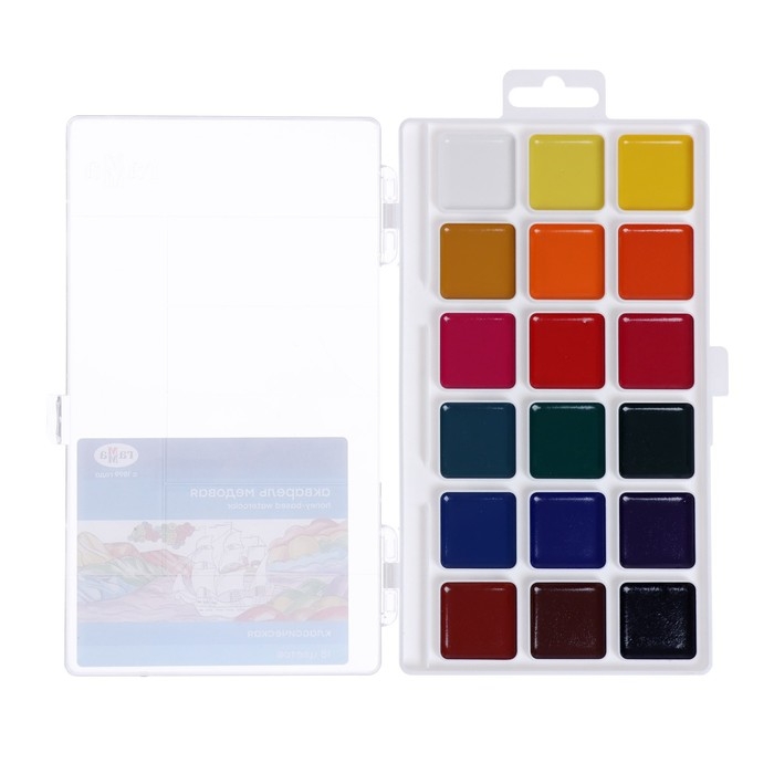Акварель безопасна для детей. Удобный пластиковый пенал, крышка плотно фиксируется и служит палитрой для смешивания красок.