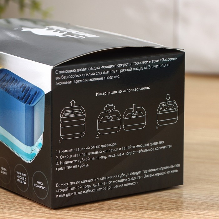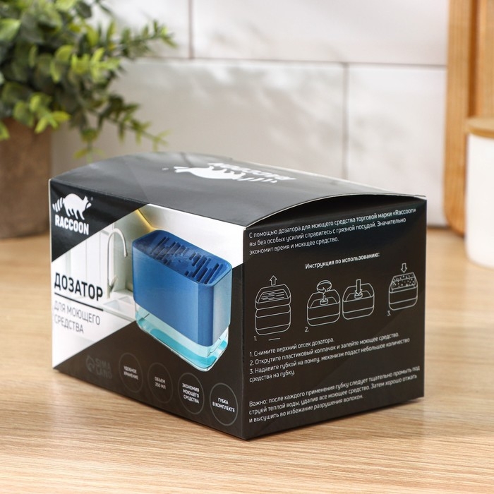 С помощью дозатора для моющего средства торговой марки Racoon вы без труда справитесь с грязной посудой.