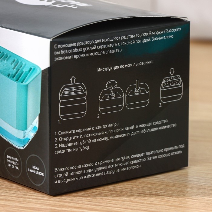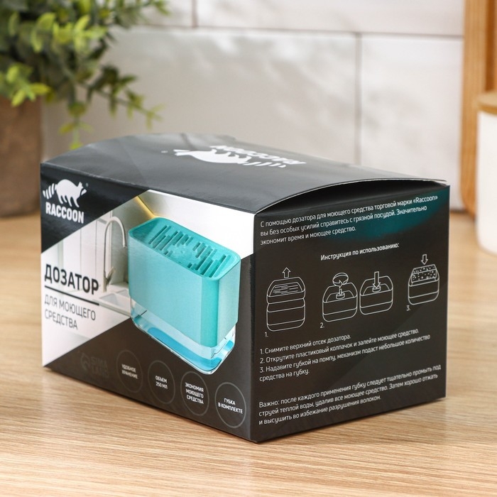 С помощью дозатора для моющего средства торговой марки Racoon вы без труда справитесь с грязной посудой.