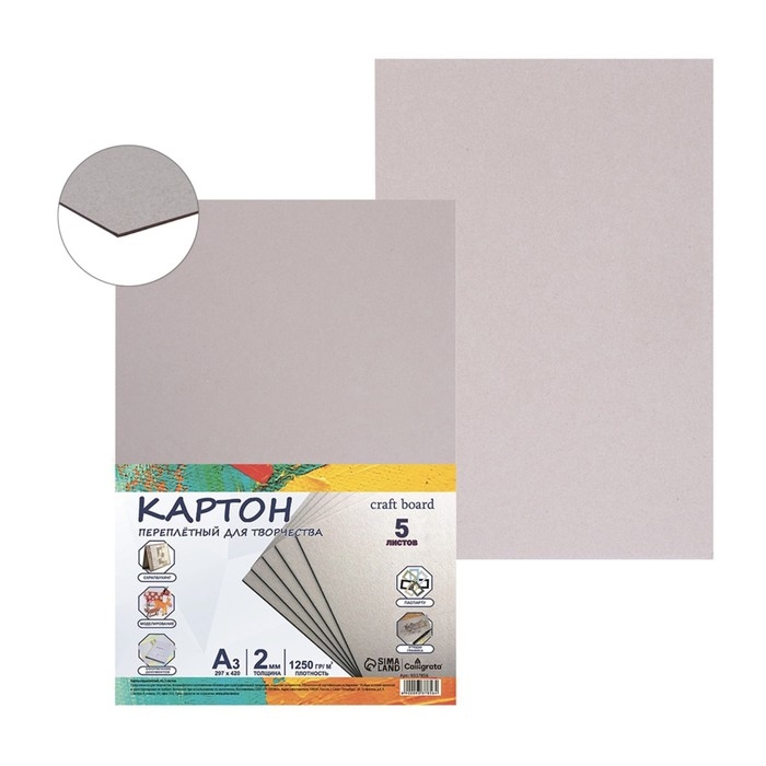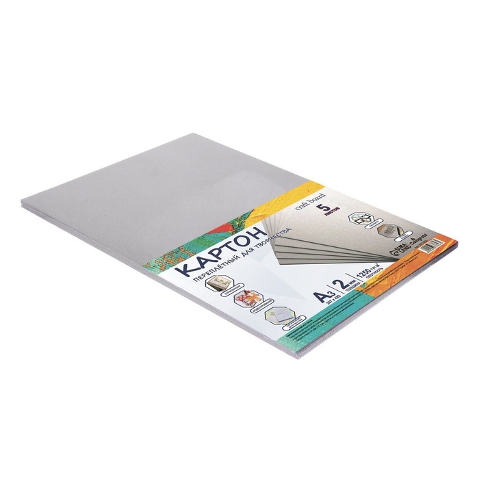 Картон переплётный А3 (297 х 420 мм), набор 5 листов, 2.0 мм, 1250 г/м2, серый, в пакете, Calligrata