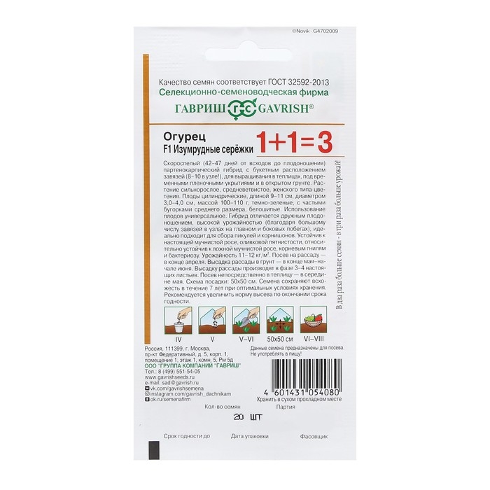 Семена Огурец "Изумрудные сережки", F1, корнишон, серия 1+1, 20 шт