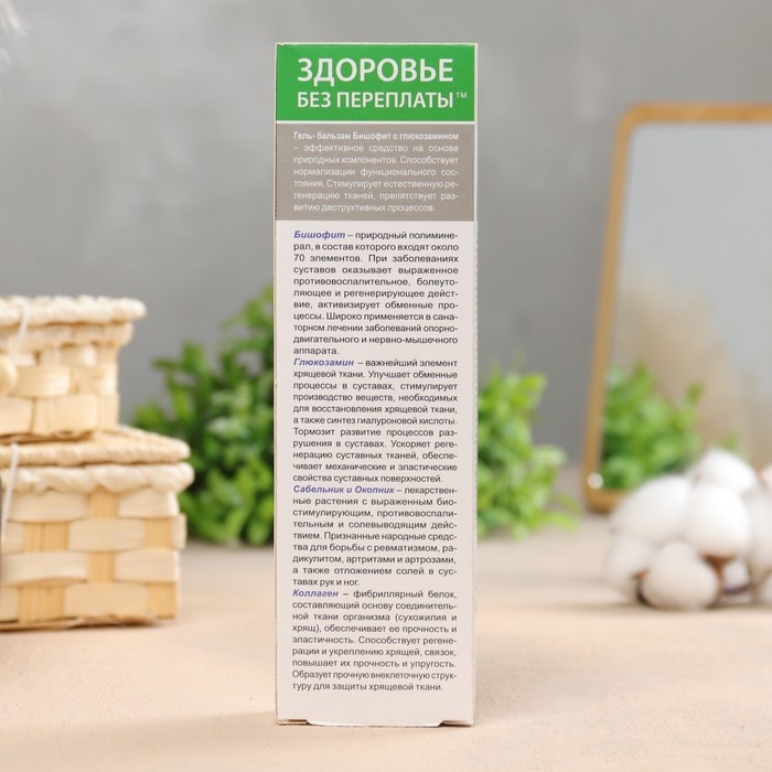 Эффективное натуральное средство профилактики заболеваний суставов и позвоночника. Создан на основе уникального природного минерала бишофит, хондропро-тектора глюкозамин и экстрактов лекарственных растений. Способствует естественной регенерации суставных тканей, препятствует развитию дистрофических процессов и преждевременному старению суставов. Оказывает противовоспалительное, противоотечное, солевыводящее, болеутоляющее и спазмолитическое действие, улучшает кровоснабжение и питание суставов. Бишофит с глюкозамином обеспечены высокой биологической активностью и синергизмом его натуральных компонентов, обладающих выраженными противовоспалительными, обезболивающими, противо-отечными, спазмолитическими, регенерирующими свойствами.