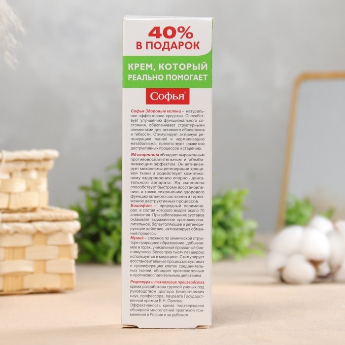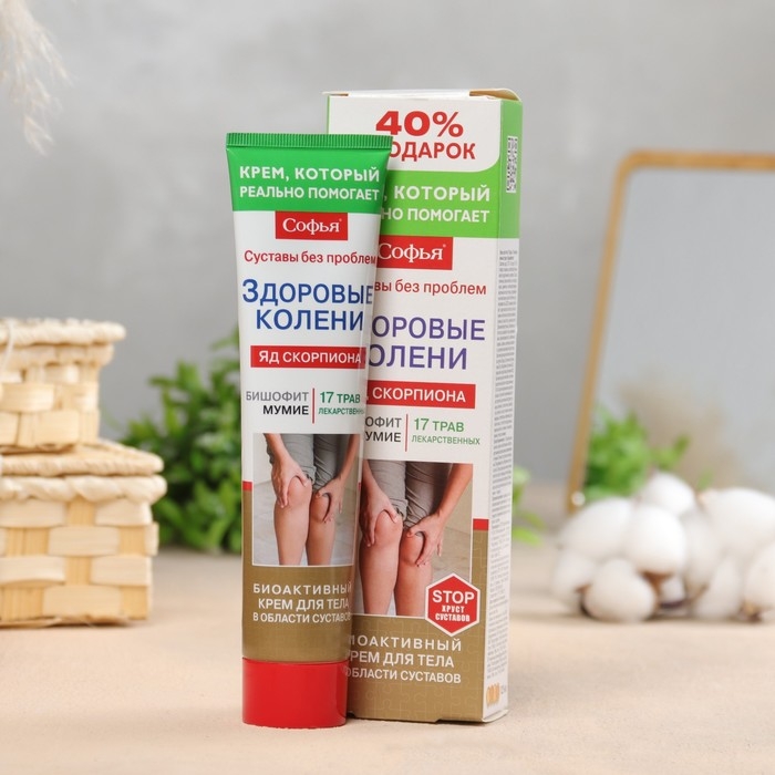Софья Здоровые колени - натуральное эффективное средство. Способствует улучшению функционального состояния опорно-двигательного аппарата, оказывает противовоспалительное, спазмолитическое действие. Стимулирует нормолизацию метаболизма в суставной ткани, тормозит диструктивные процессы. Препятствует образованию солевых отложений, уменьшает болезненные проявления, снижает риск развития и прогрессирования артритов, остеоартрозов и остеохондроза.