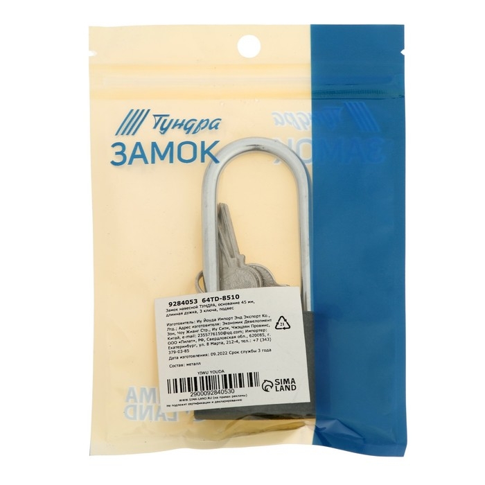 Замок навесной ТУНДРА, основание 45 мм, длинная дужка, 3 ключа, подвес