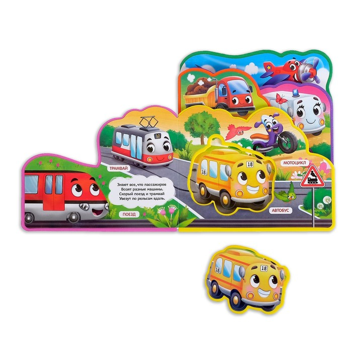 С книгой малыш получит свои первые знания о разных видах транспорта. Внутри есть 4 мягких вынимающихся пазла, с которыми ребёнок сможет поиграть.