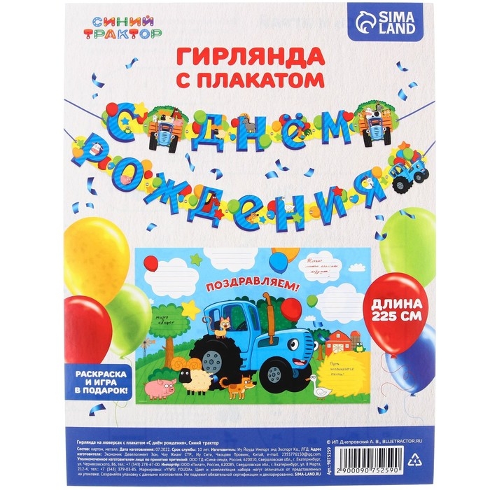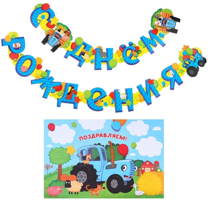 Гирлянда на люверсах "С Днем Рождения", длина 225 см, с плакатом 60х40 см, Синий трактор