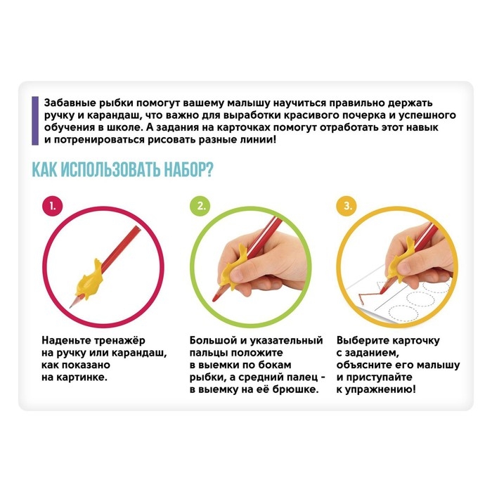 С тренажёром для письма ребёнок научится правильно держать ручки и карандаши, потренирует мелкую моторику рук и координацию движений.