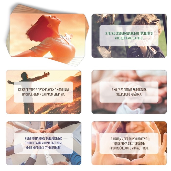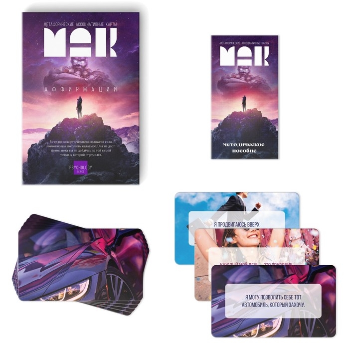 Метафорические ассоциативные карты (МАК) — это набор картинок, которые используют для диагностики и проработки психологических проблем, а также для обучения, самопознания, игр и творчества. К аффирмации можно отнести короткие и чётко сформулированные фразы, которые необходимо многократно повторять для действенности. Только так позитивная установка, заложенная в эту фразу, фиксируется в подсознании человека. Частое повторение коротких фраз называют аутотренингом, который положительно воздействует на психоэмоциональное состояние и способствует позитивным изменениям в жизни.