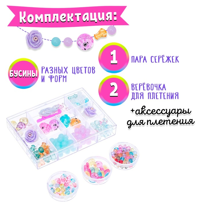 В комплекте есть всё необходимое: основа для изделий, бусины разных размеров, подвесы.