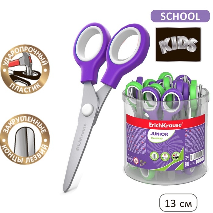 Ножницы детские ErichKrause Junior, 13 см, с закруглёнными концами лезвий, ударопрочный пластик, в тубусе, МИКС