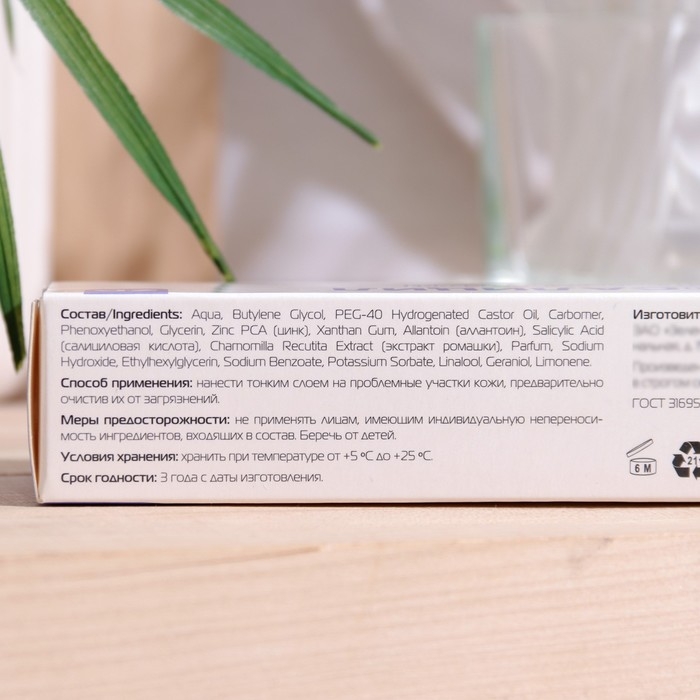 Состав: aqua, butylene glycol, PEG-40 hydrogenated castor Oil, carbomer, phenoxyethanol, glycerin, Zinc PCA (цинк), xanthan gum, allantoin (аллантоин), salicylic acid (салициловая кислота), chamomilla recutita extract (экстракт ромашки), parfum, sodium hydroxide, ethylhexylglycerin, sodium benzoate, potassium sorbate, linalool, geraniol, limonene.