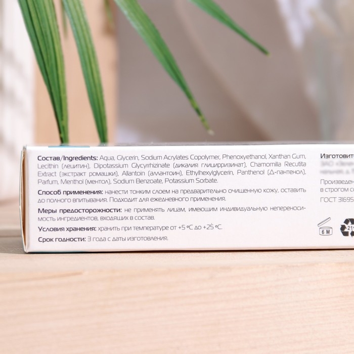 Состав: aqua, glycerin, sodium acrylates copolymer, phenoxyethanol, xanthan gum, lecithin (лецитин), dipotassium glycyrrhizinate (дикалия глицирризинат), chamomilla recutita extract (экстракт ромашки), allantoin (аллантоин), ethylhexylglycerin, panthenol (Д-пантенол), parfum, menthol (ментол), sodium benzoate, potassium sorbate.