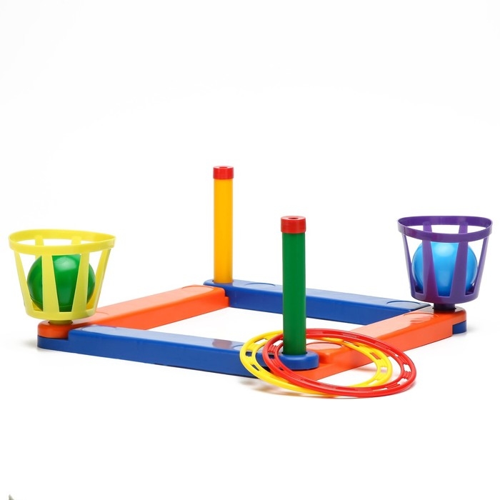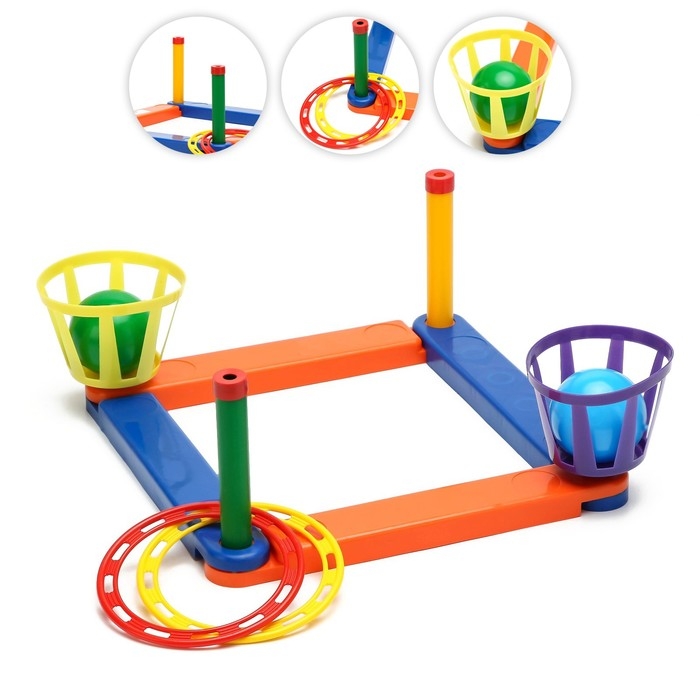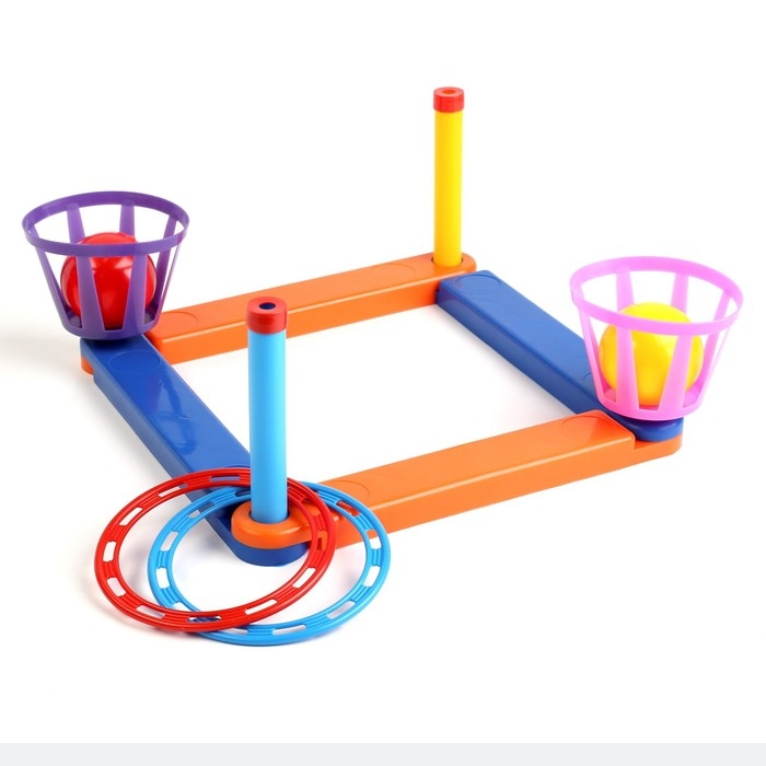 Детская игра "Кольцеброс и шароброс" - это увлекательная активная игра для детей и взрослых, в которой игрок бросает мячик и кольцо в корзинки (ловушки) и вертикальные стойки.