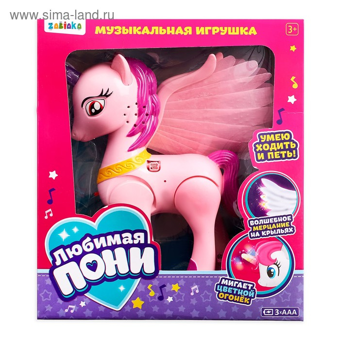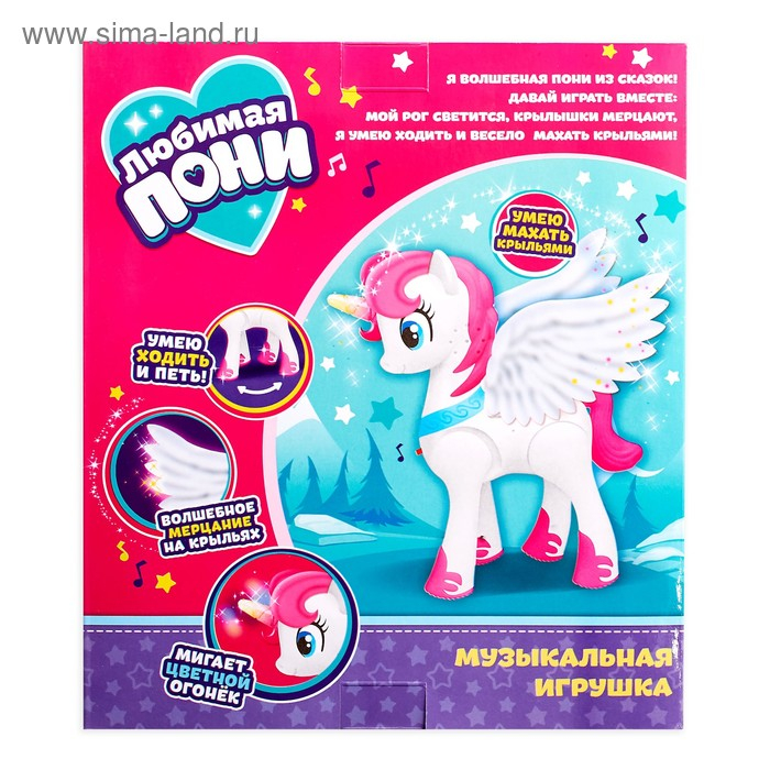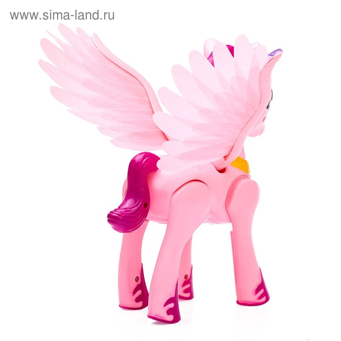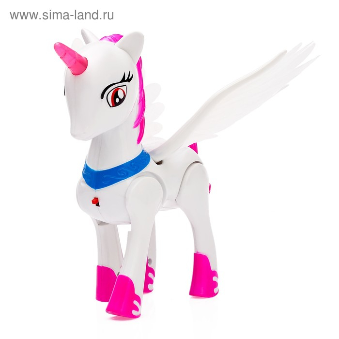 Эта сказочная лошадка не только выглядит необычно, но и имеет волшебные функции. У игрушки светится и мигает разноцветными огнями рог. Лошадка ходит и машет мерцающими крыльями. Игрушка издаёт звуки: цокот копыт и весёлую мелодию.