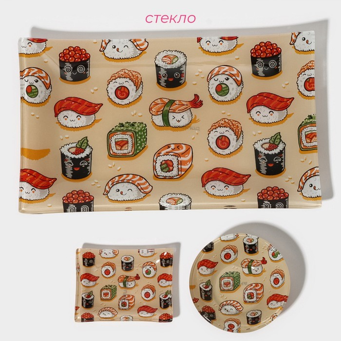 Набор для суши из стекла Доляна «Сет», 3 предмета: соусники 8×2 см, 8×6 см, подставка 25×15×2 см