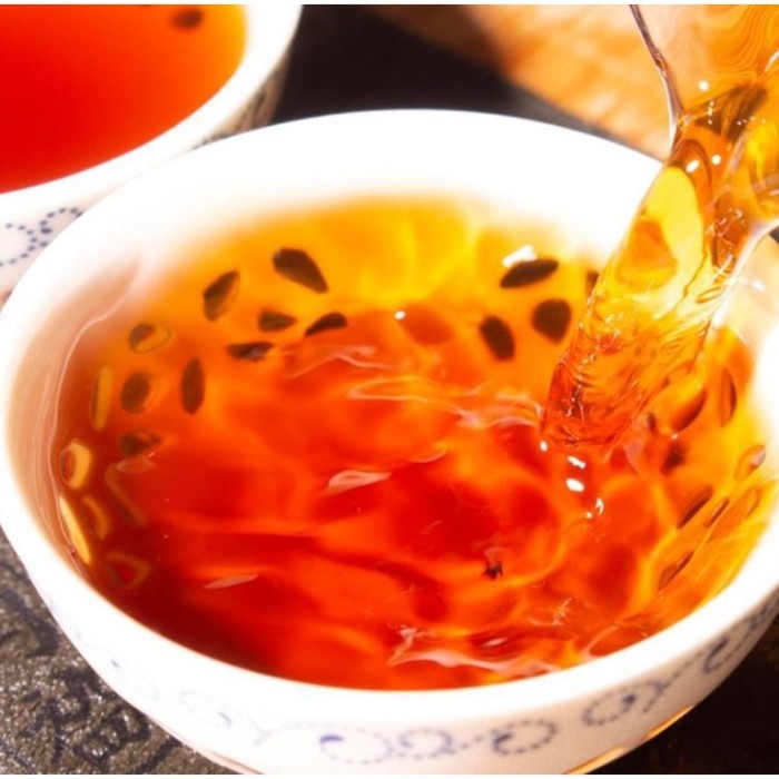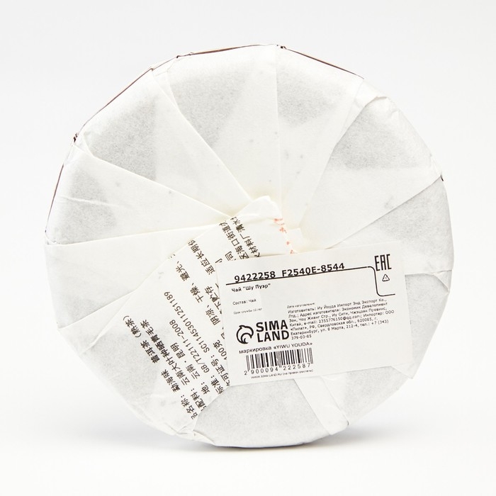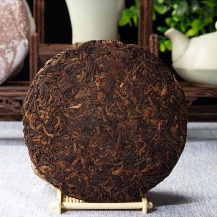 Шу Пуэр от фабрики, расположенной в Мэнхае спрессован в блинчик из мелкого, неоднородного чуть пыльного сырья, в состав которого вошли: мэнхайский и линцанский пуэр 3 сорта, а также небольшое количество гунтина и почек.