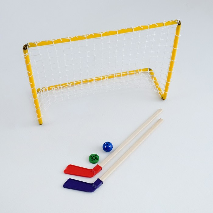 Хоккейный набор 3 в 1, 2 клюшки 73 см, ворота 4 штуки, 2 мяча d-5.5 см, клин 8 штук
