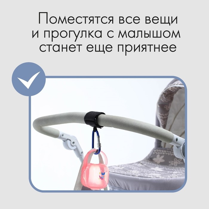 Универсальный карабин на липучке - это незаменимый аксессуар для мам. Карабин легко крепится к различным поверхностям, таким как коляски, сумки, тележки, к ручкам велосипедов мопедов квадроциклов. Карабин идеально подходит для использования во время прогулок с коляской, так как он позволяет закреплять сумки и корзины на ручку коляски, освобождая руки мамы. Карабин также может быть использован для закрепления детской сумки на рюкзаке или защелкивания держателя для ключей на детской одежде. Карабин подойдет для подвешивания сумок или пакетов в автомобиле, просто зацепите его липучкой за крепление подголовника.