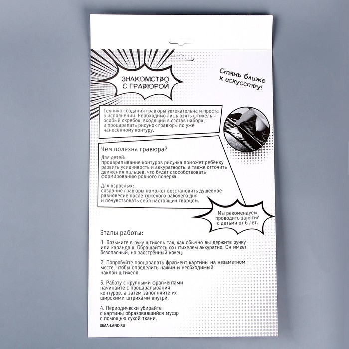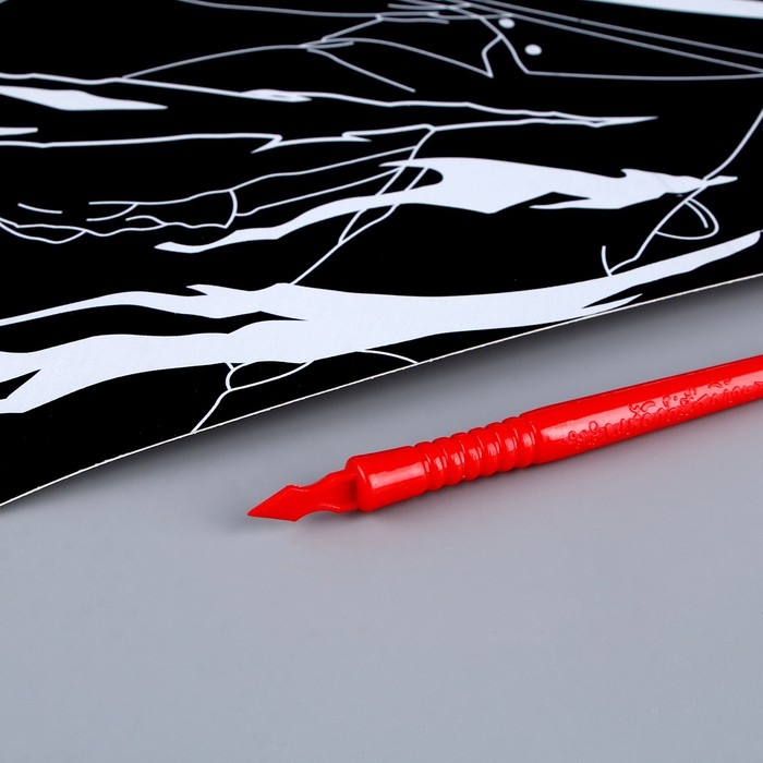 Чтобы создать невероятно красивую гравюру, достаточно процарапать намеченные контуры рисунка специальным инструментом — штихелем. И дети и взрослые будут с удовольствием соскребать верхний слой гравюры с контуров будущей картины, под которым находится сверкающая фольга!