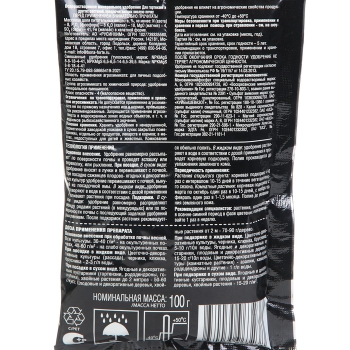 Массовая доля питательных веществ, %: Азот – 8, Фосфор – 8, Калий – 18, Магний – 4, Сера – 41, Железо в хелатной форме