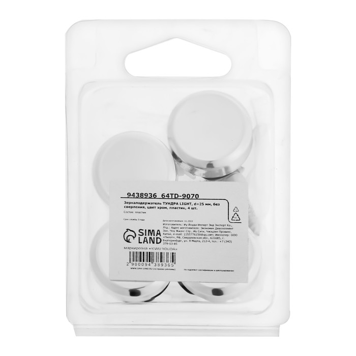 Зеркалодержатель ТУНДРА LIGHT, d=25 мм, без сверления, цвет хром, пластик, 4 шт.