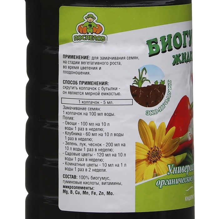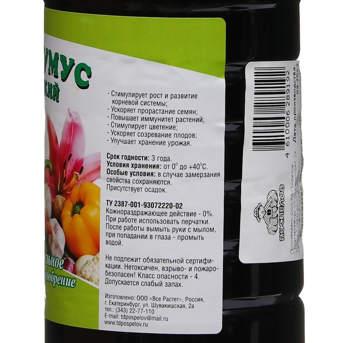Удобрение содержит природные гуминовые соединения, а также основные микро- и макроэлементы, необходимые для полноценного роста и развития растений в доступной для них форме.