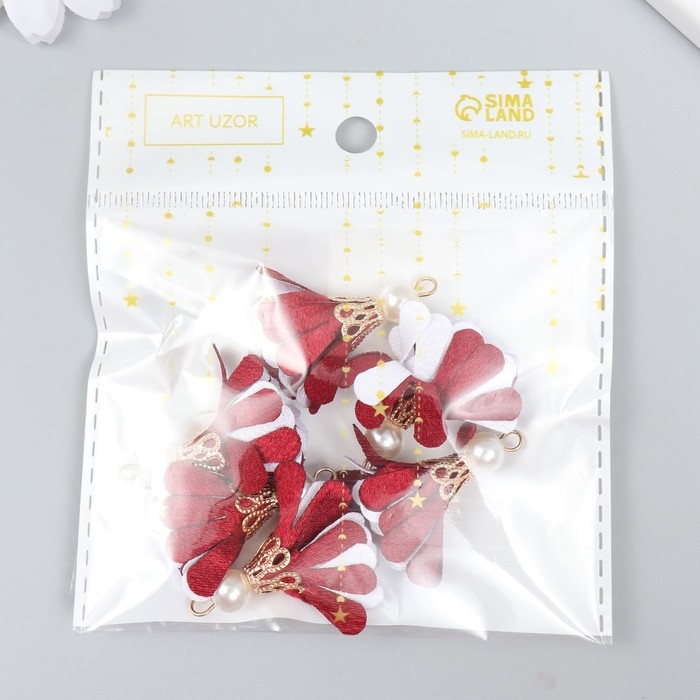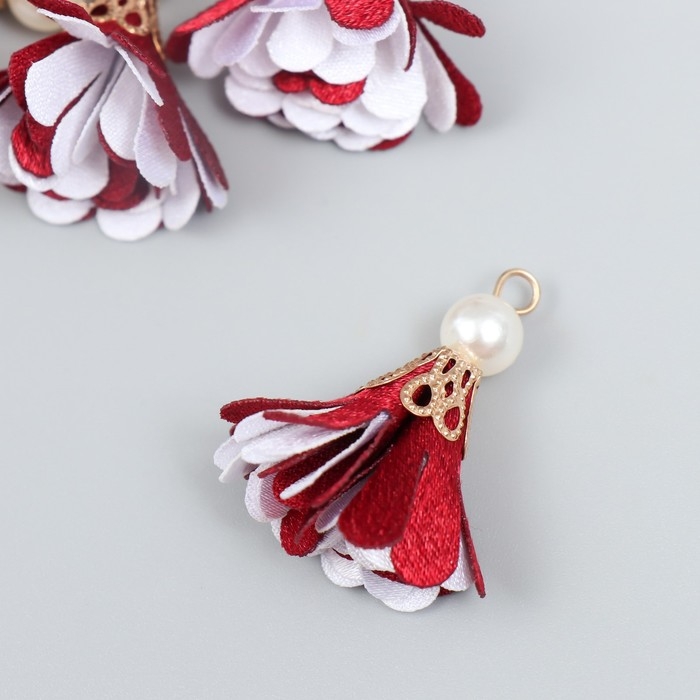 Декор текстиль "Цветок 2 цвета с жемчужиной. Бордовый и белый" набор 6 шт 3 см