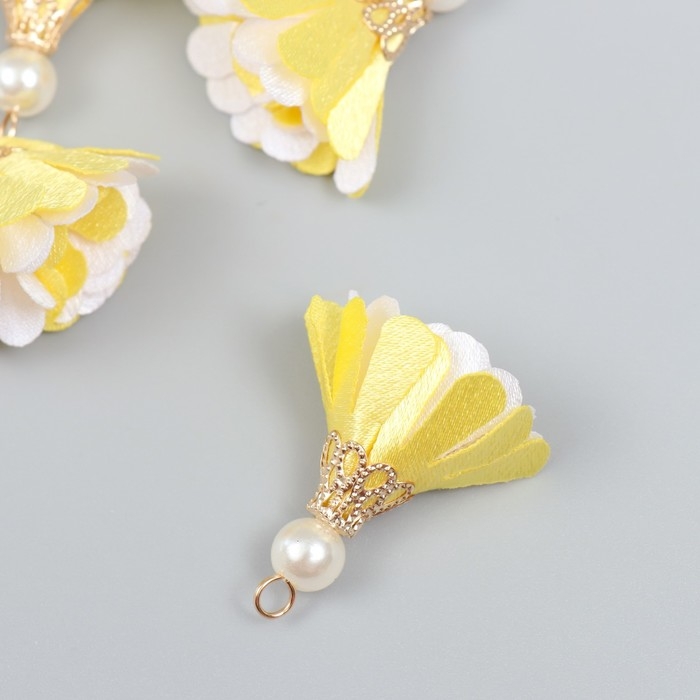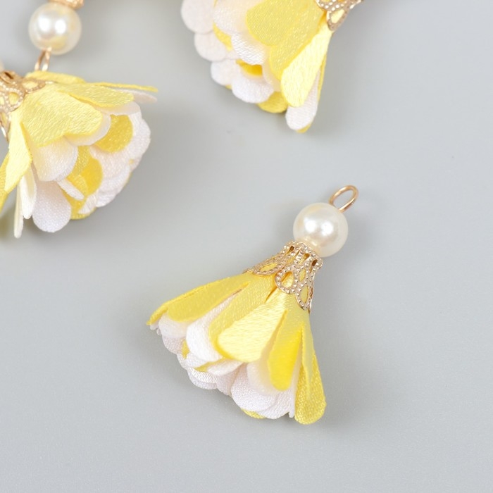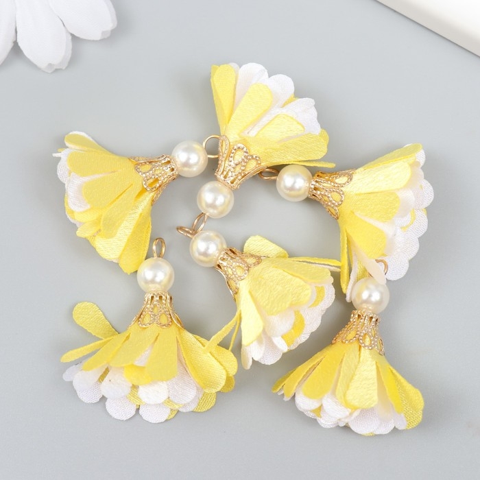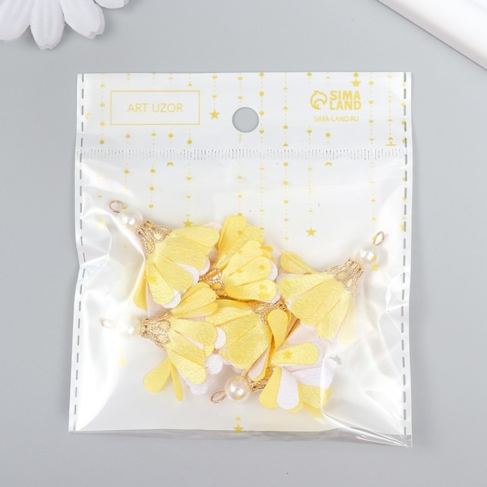 Декор текстиль "Цветок 2 цвета с жемчужиной. Жёлтый и белый" набор 6 шт 3 см