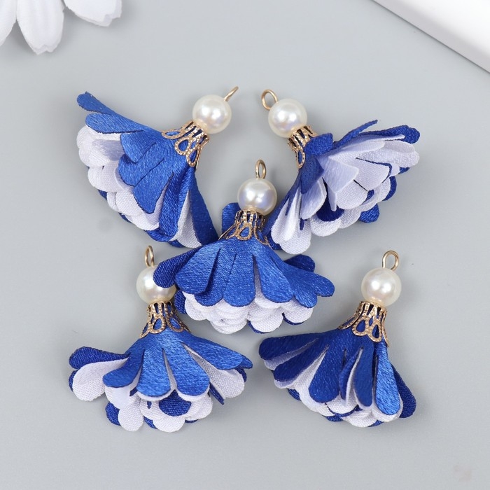 Декор текстиль "Цветок 2 цвета с жемчужиной. Ультрамарин и белый" набор 6 шт 3 см