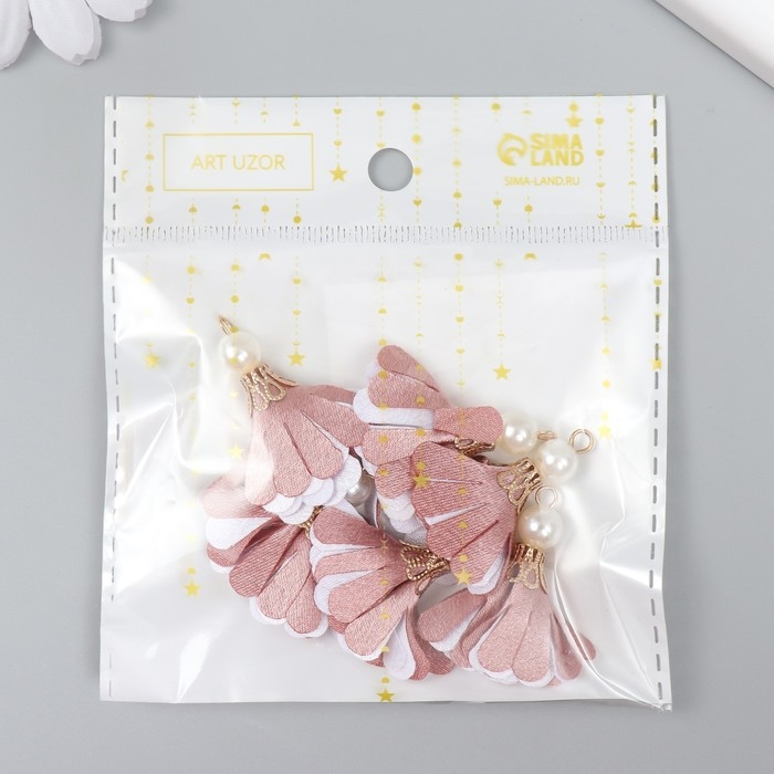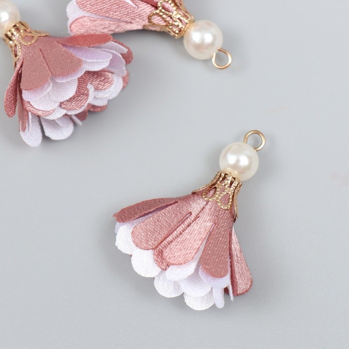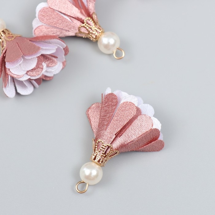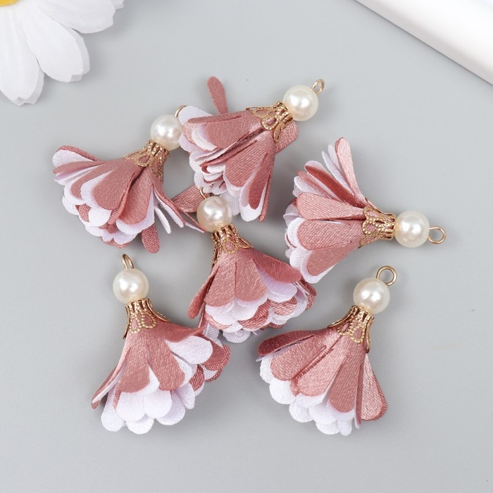 Декор текстиль "Цветок 2 цвета с жемчужиной. Пыльная роза и белый" набор 6 шт 3 см