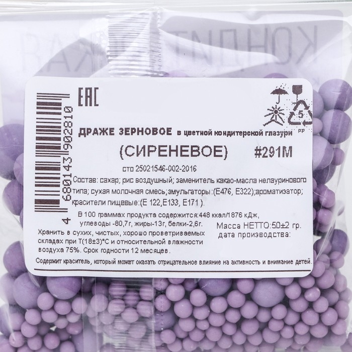 Кондитерская посыпка с мягким центром матовая "Жемчуг" сиреневая, 50 г