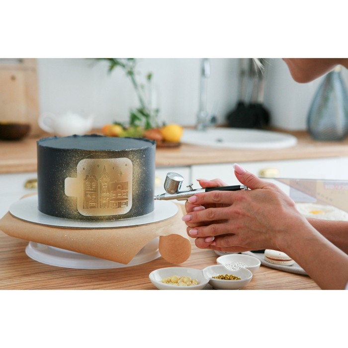Кондитерский аэрограф — незаменимый инструмент для окрашивания тортов, пирожных и других десертов. Аэрограф дополнит арсенал как профессионального кулинара, так и любителя. Преимущество устройства в том, что цветное покрытие наносится равномерным тонким слоем. А также с этим инструментом меньше расходуется краситель, поэтому вы точно не добавите лишнего.