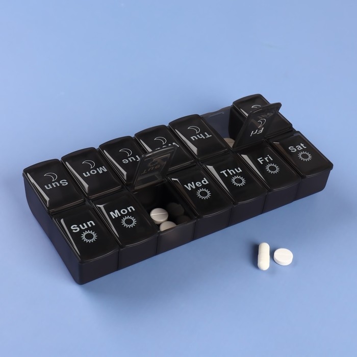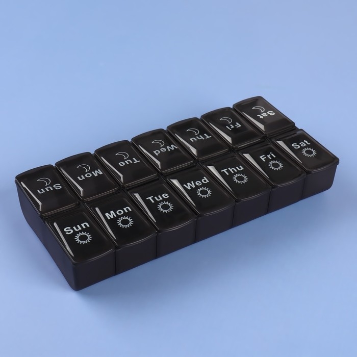 Таблетница - органайзер «Неделька», со съёмными ячейками, английские буквы, утро/вечер, 7 контейнеров по 2 ячейки, цвет чёрный