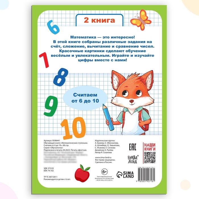 Книга «Математические ступеньки. Считаем от 6 до 10» разработана для дошкольного обучения малышей с 6 лет. В ней собраны интересные задания на проработку разных навыков. Выполняя упражнения, ребёнок познакомится с числами от 6 до 10, а примеры и задачки помогут ему в доступной игровой форме закрепить простейшие математические действия в пределах 10.
