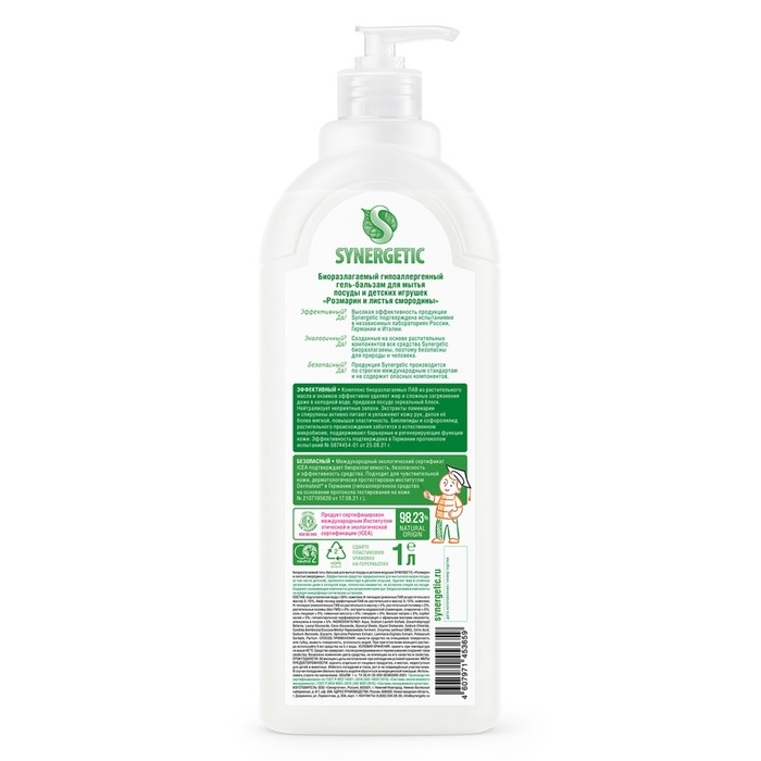 Биоразлагаемый гель-бальзам для мытья посуды и детских игрушек SYNERGETIC "Розмарин и листья смородины" - это экологичное, безопасное и эффективное средство для мытья всех видов посуды, в том числе детской, кухонного инвентаря и детских игрушек от любых видов загрязнений.