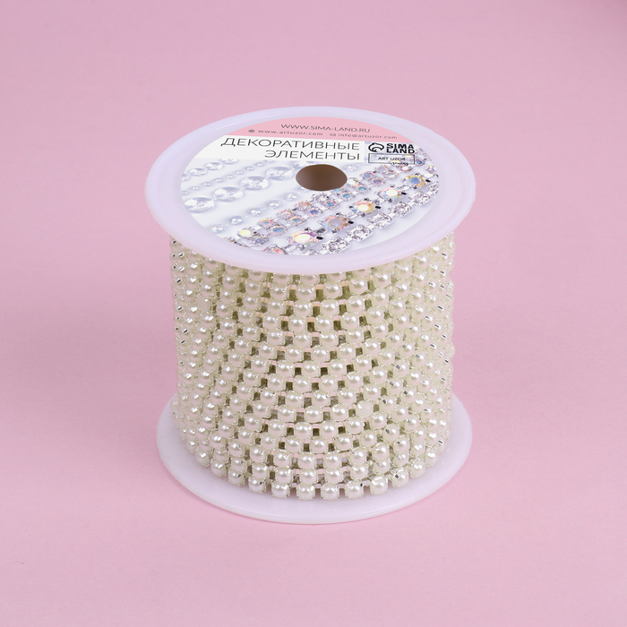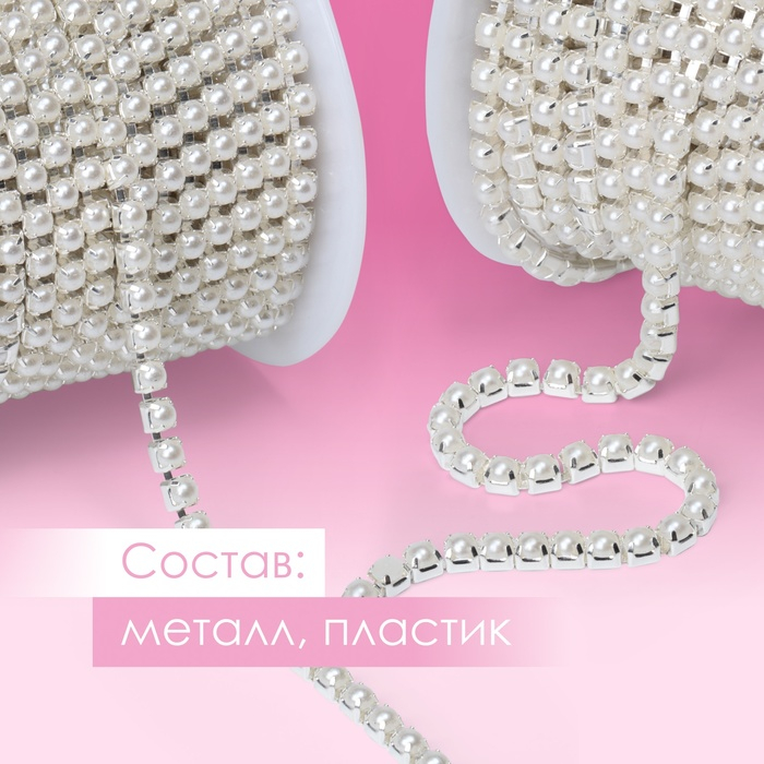 Цепь с жемчугом, металл, пластик, 3,5 мм, 9 ± 1 м, цвет серебряный