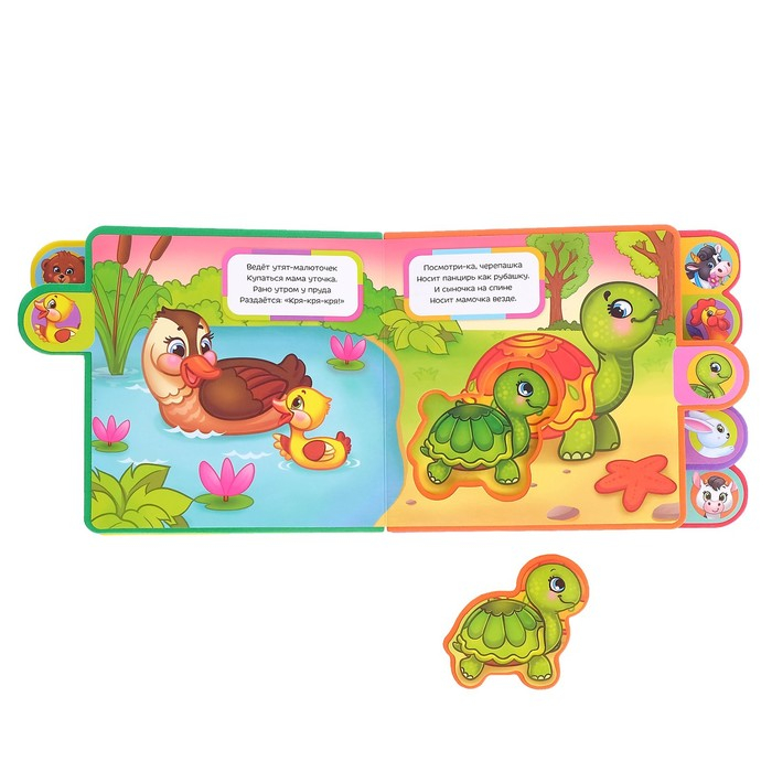 С мягкой книгой малыш получит свои первые знания о животных и их детёнышах. А также сможет поиграть с 5 вынимающимися пазлами.