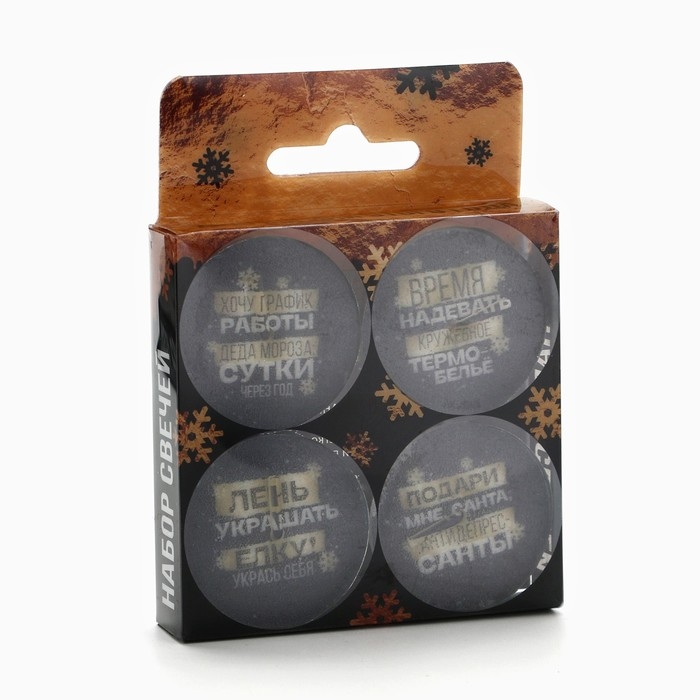 Подарочный набор чайных свечей с приколом, без аромата, не только наполнит ваш дом радостной атмосферой предвкушения праздника, но и дополнит предпраздничный интерьер вместе с елкой и гирляндами. Свечи выполнены в жестяных гильзах (3,7 х 3,7 х 1 см.), которые дополнены эксклюзивной печатью на самом изделии. Также свечи упакованы в подарочную коробку (7,7 х 1,7 х 10,5 см), что позволит использовать их в качестве подарка маме, сестре, бабушке, подруге, девушке!