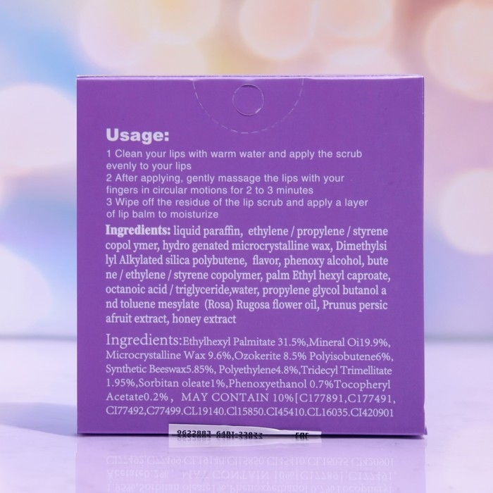 Состав скраба: этилгексилпальмитат, минеральное масло, микрокристаллический воск, озокерит, полиизобутен, синтетический пчелиный воск, полиэтилен, тридецилтримеллитат, олеат сорбитана, феноксиэтанол, витамин Е, может содержать: C177891, C177491. CI77492,C77499.Cl19140, Cl15850, Cl45410, Cl16035, Cl420901