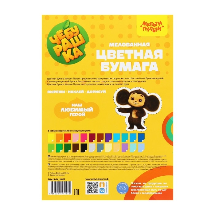 Набор цветной мелованной бумаги "Мульти-Пульти" серии "Чебурашка" отлично подойдет для творчества. На оборотной стороне обложки расположен персонаж, которого можно вырезать и сделать с ним аппликацию. Бумага имеет размер 200 х 275 мм. Плотность бумаги – 55 г/м2. В наборе представлено 24 ярких цвета мелованной бумаги на 24 листах, соединённых скрепкой.Бумага окрашена с одной стороны и упакована в папку из высококачественного целлюлозного картона. Товар сертифицирован для детей от 3 лет.