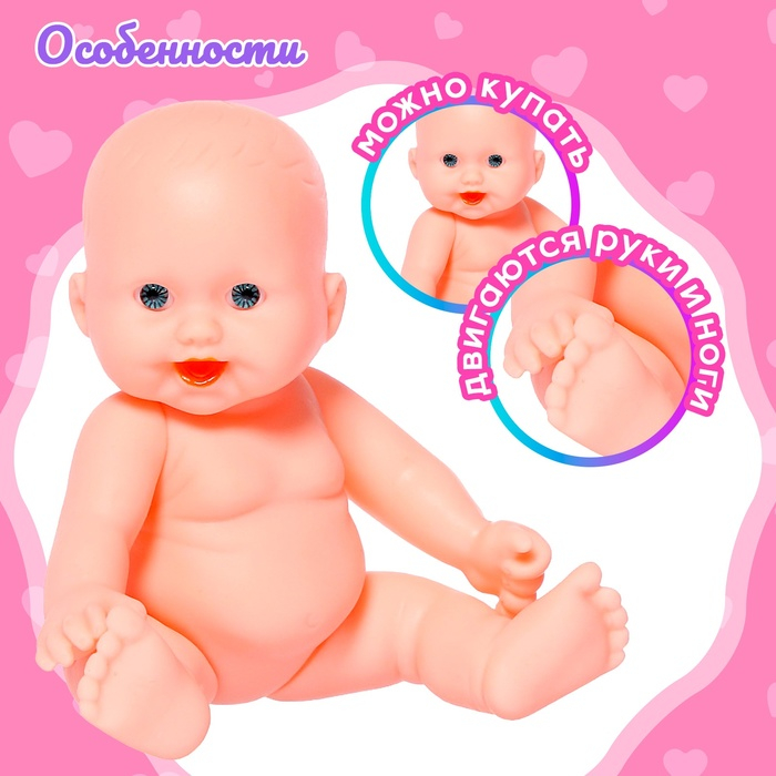 У куклы двигаются руки, ноги. Ребёнок придумает множество игр с пупсом и будет учиться заботе и ответственности. Рост куклы — 12 см. Пупсик выполнен из пластика. Его можно купать.