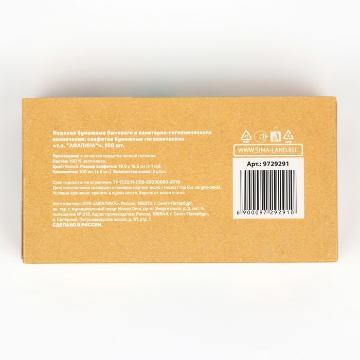 В упаковке 100 сухих бумажных двуслойных салфеток размером 20 х 20 см.