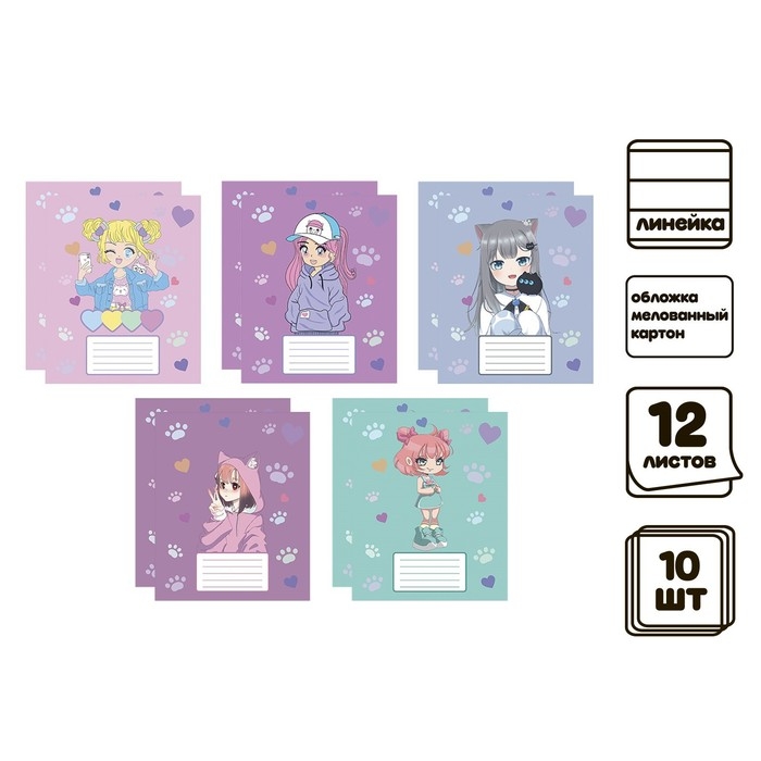 Комплект тетрадей из 10 штук, 12 листов в линию Calligrata "Аниме 013", обложка мелованный картон, ВД-лак, блок №2, белизна 75% (серые листы), 5 видов по 2 штуки