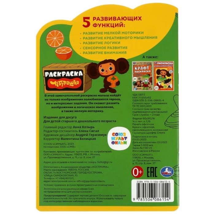 Раскраска с развивающими заданиями «Чебурашка»