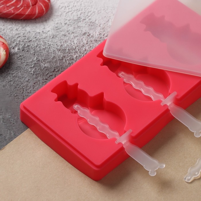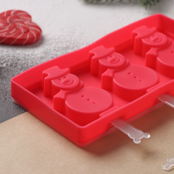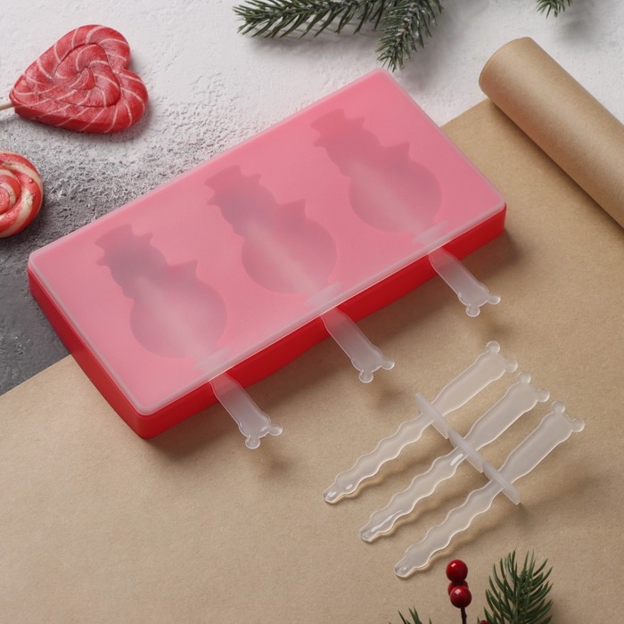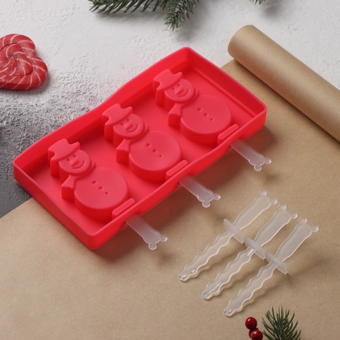 Форма для мороженого новогодняя Доляна «Снеговик», силикон, 18×9×2 см, 3 ячейки, с палочками, цвет красный