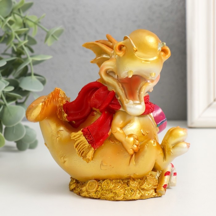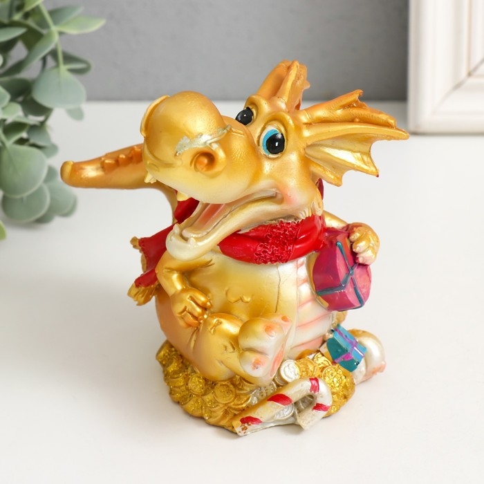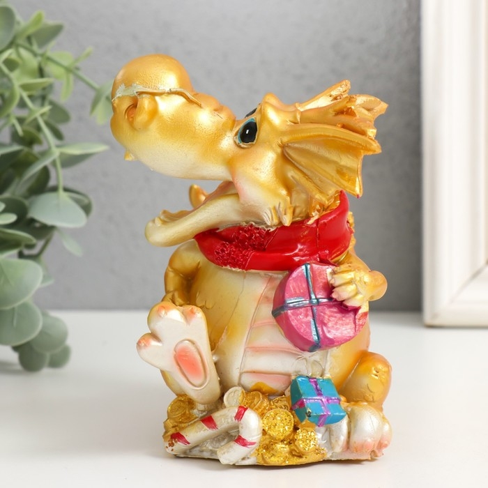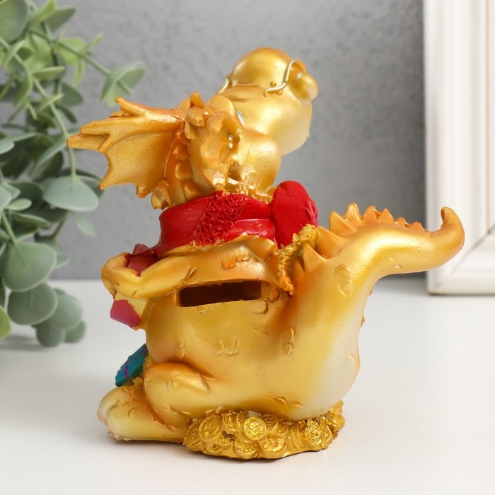 Копилка полистоун "Дракон золотистый в новогоднем шарфе с подарками" МИКС 8,5х11х12,5 см