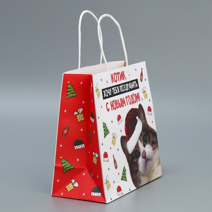 Пакет подарочный новогодний крафтовый «Котик», 22 х 22 х 11 см, Новый год