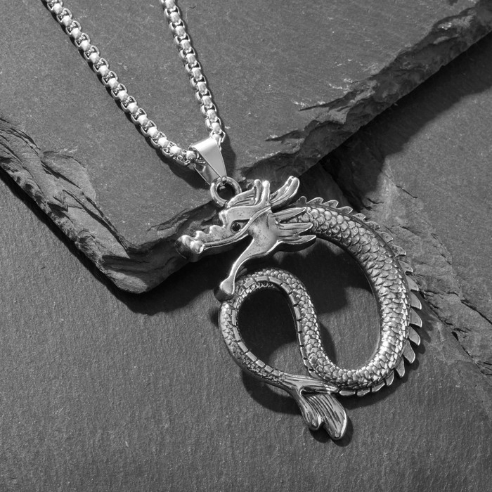 Кулон «Дракон» хищник, цвет чернёное серебро, 70 см