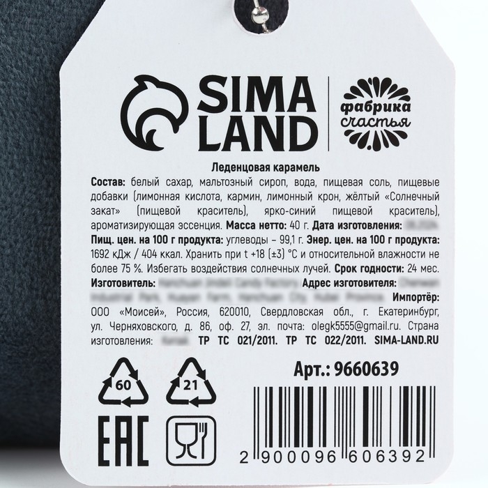 Состав: Белый гранулированный сахар, мальтозный сироп, пищевые добавки (лимонная кислота, красный очаровательный АС (пищевой краситель), лимонно - жёлтый (пищевой краситель), бриллиантовый синий (пищевой краситель), эритрозин), ароматизирующая пищевая эссенция.