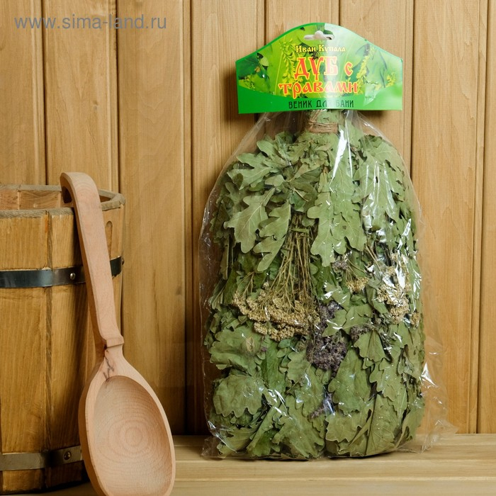Веник для бани дубовый с букетом трав, в индивидуальной упаковке